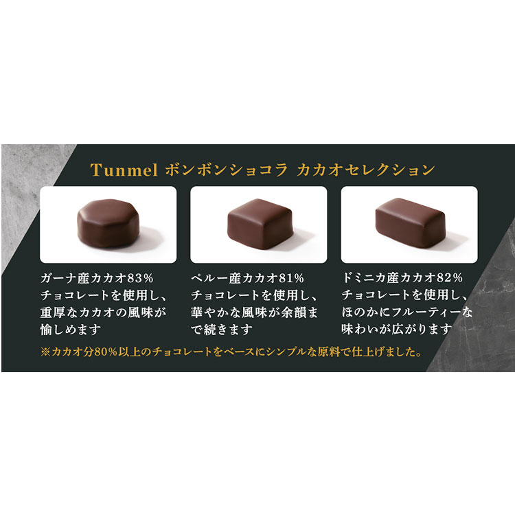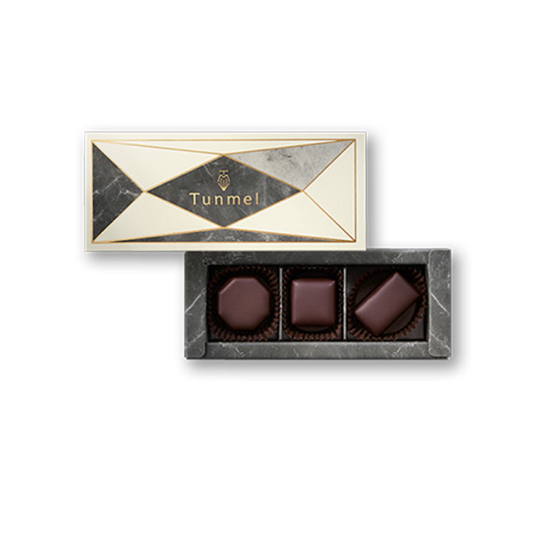 カカオ分80%以上のチョコレートを使用した、3種のカカオの個性を愉しめるボンボンショコラのアソート。正方形のペルー産は、なめらかなくちどけとシナモンのような華やかな風味が、余韻まで続きます。長方形のドミニカ産は、甘みと酸味のバランスがとれた、ほのかにフルーティーな味わいが広がります。多角形のガーナ産は、重厚なカカオの風味とくちどけが織りなす、王道の味わいが愉しめます。