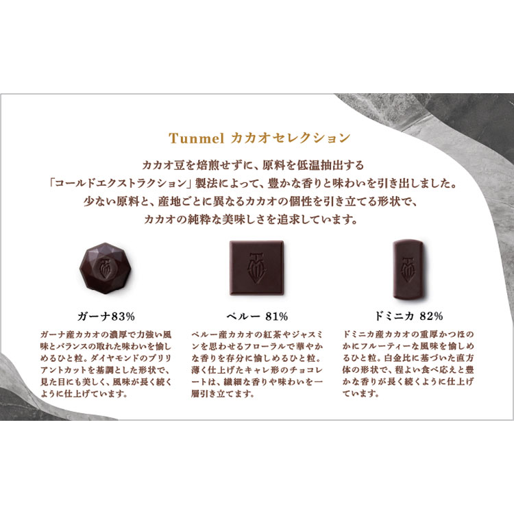 ペルー、ガーナ、ドミニカ産の3種のカカオの個性を愉しめる特別なアソート。ペルー産はフローラルで華やかな香りが特徴です。ガーナ産は濃厚で力強い風味が広がり、バランスの取れた重厚感を愉しめます。ドミニカ産は、ほのかにフルーティーな香りを持ち、程よい食べ応えが特徴です。
